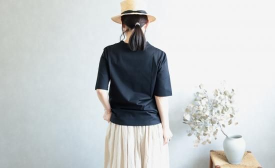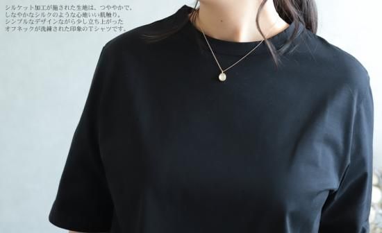 シンプルなデザインながら少し立ち上がったオフネックが洗練された印象で上品、1枚でも様になるTシャツ。