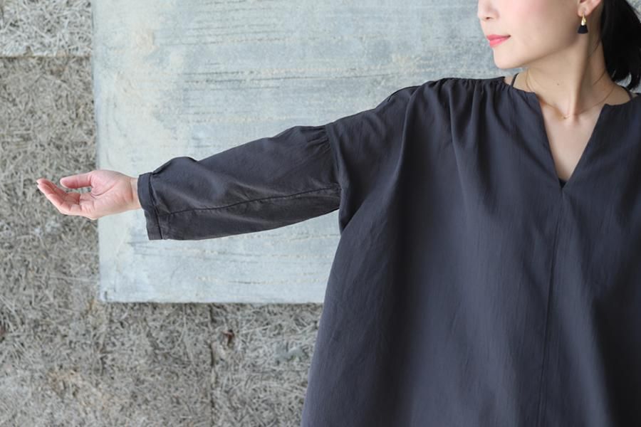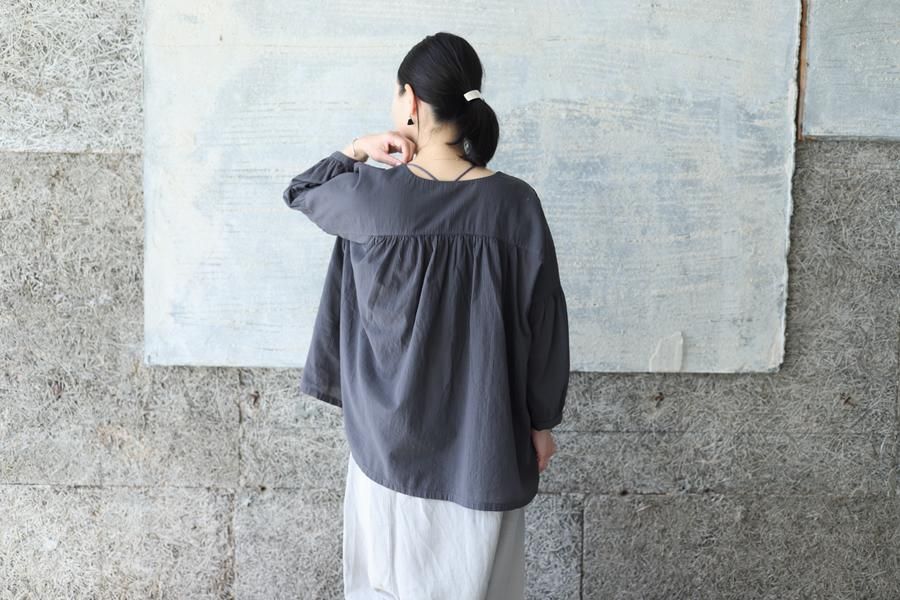 こちらは2022年春夏の新作のたっぷりと寄せたギャザーの生地が風をはらみ、軽やかに揺らぐプルオーバーです。