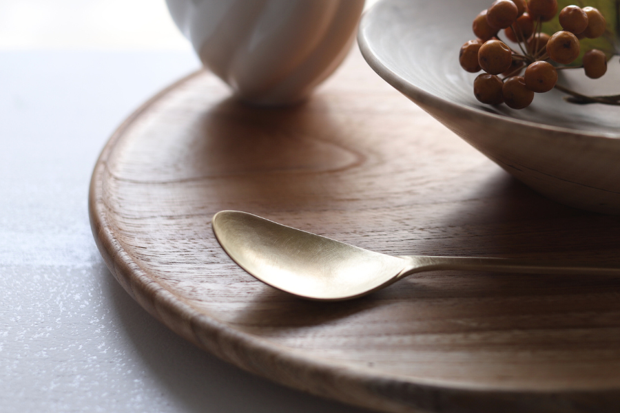 木そのままの器や、草木染めを施しガラスコーティングで仕上げた器と匙などを作られています。